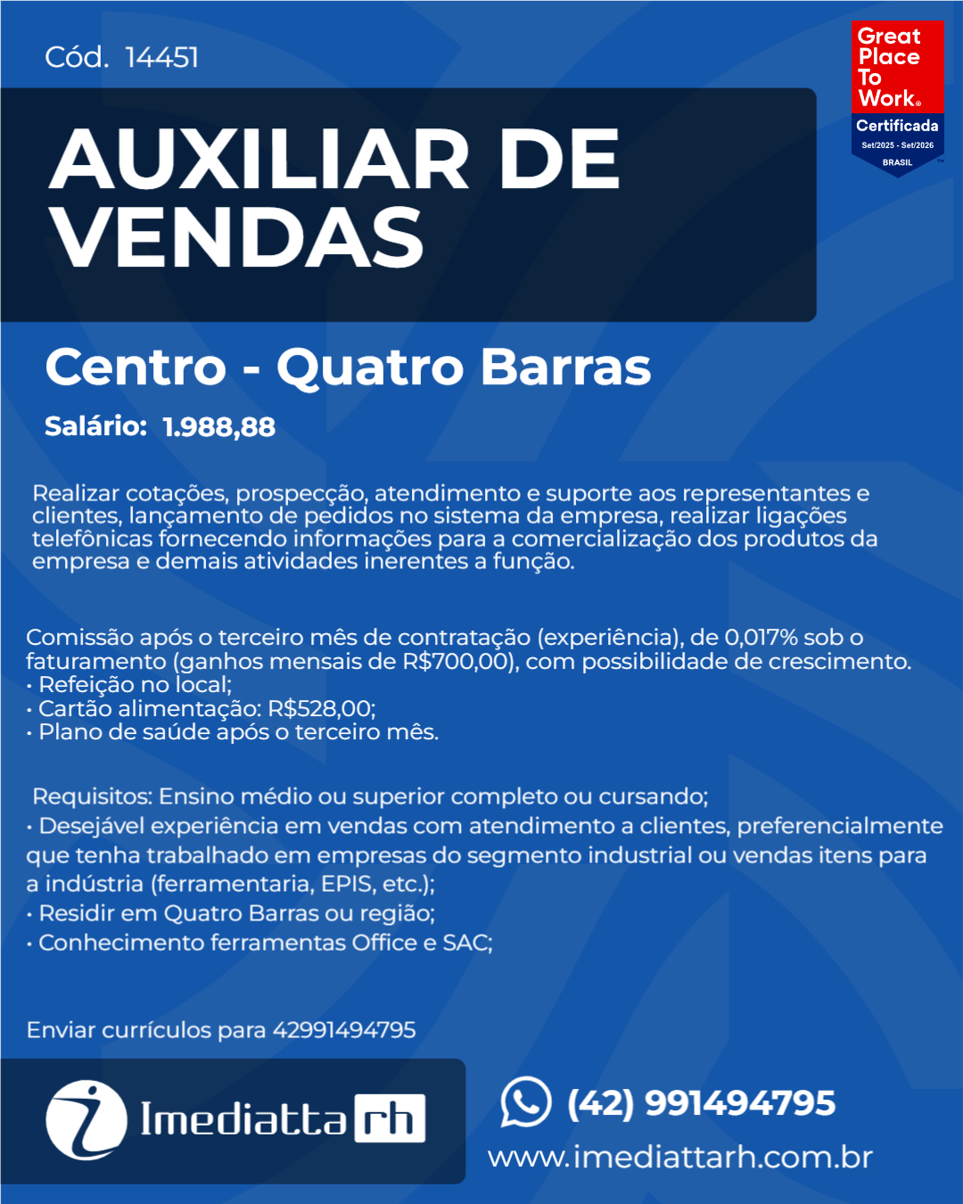 Auxiliar de Vendas – Quatro Barras (Centro)